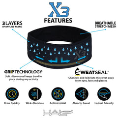 Az új, 3” (7,6 cm) széles Halo X3 - Pullover fejpánt a tökéletes izzadságszalag. Akárcsak a már bevált X2 fejpántunk, ez is kiválóan működik még az erősen izzadók számára is. A három rétegű Dryline® anyag maximalizálja az izzadság felszívását. A belső SweatSeal® csatornák az izzadságot hátrafelé és távol vezetik a szemedtől, arcodtól és szemüvegedtől – még akkor is, ha a fejpánt teljesen átázik.