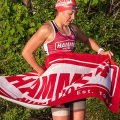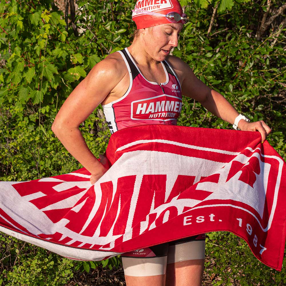 Designul Hammer Nutrition nu este imprimat, ci țesut direct în materialul prosopului, astfel că, dacă este spălat corespunzător, contracția este minimă și culorile nu se estompează.